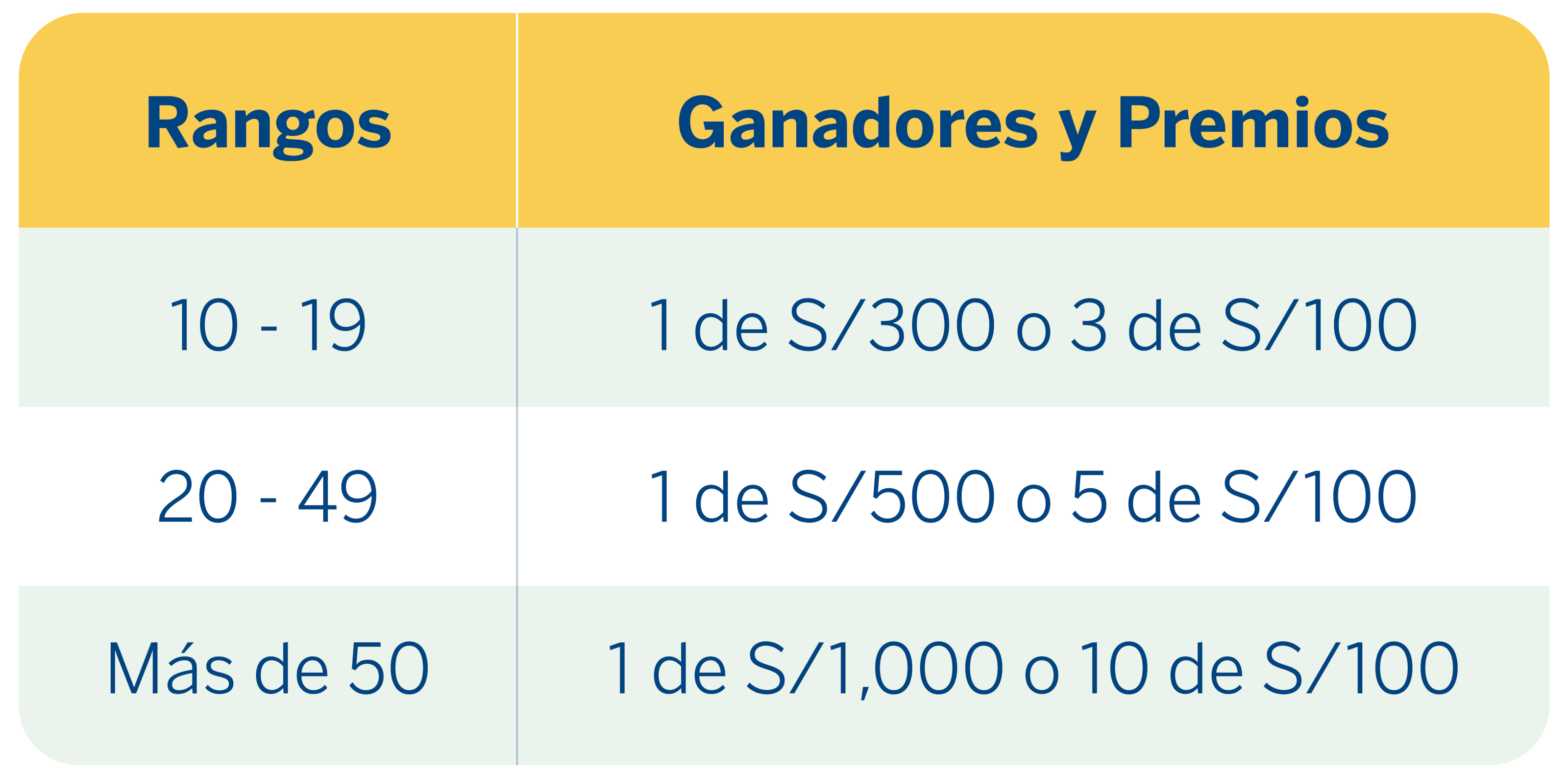 - Mayor a 301 sueldos BBVA: 15 ganadores de S/100 o o 30 ganadores de S/50