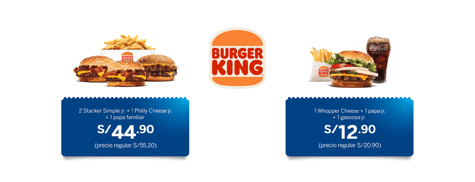 1 Whopper Cheese + 1 papa jr. + 1 gaseosa jr. a solo S/12.90 (precio regular S/20.90):