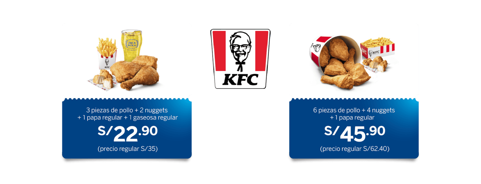 Promoción válida del 16 de diciembre de 2024 al 31 de marzo de 2025. Aplica para pagos con Tarjeta de Crédito y/o Débito del BBVA. 03 piezas de pollo + 02 nuggets + 01 papa regular + 01 gaseosa regular a solo S/22.90 (precio referencial S/35.00). Las piezas de pollo son combinadas de acuerdo a la disponibilidad de la tienda. Promoción válida para mayores de 16 años. Máximo 02 promociones por cliente por día. Válido para consumo en salón y para llevar en todos los locales a nivel nacional, menos en el local del Aeropuerto Jorge Chávez. El cliente deberá solicitar el beneficio antes que se genere el comprobante de pago por parte del establecimiento, de lo contrario el descuento no podrá ser aplicable. No válido para delivery, auto rápido, kioscos digitales ni recojo en tienda. No acumulable con otras promociones y/o descuentos. Sujeto a modificación sin previo aviso de acuerdo a las disposiciones del gobierno. Imágenes referenciales. Stock sujeto a disponibilidad del restaurante.