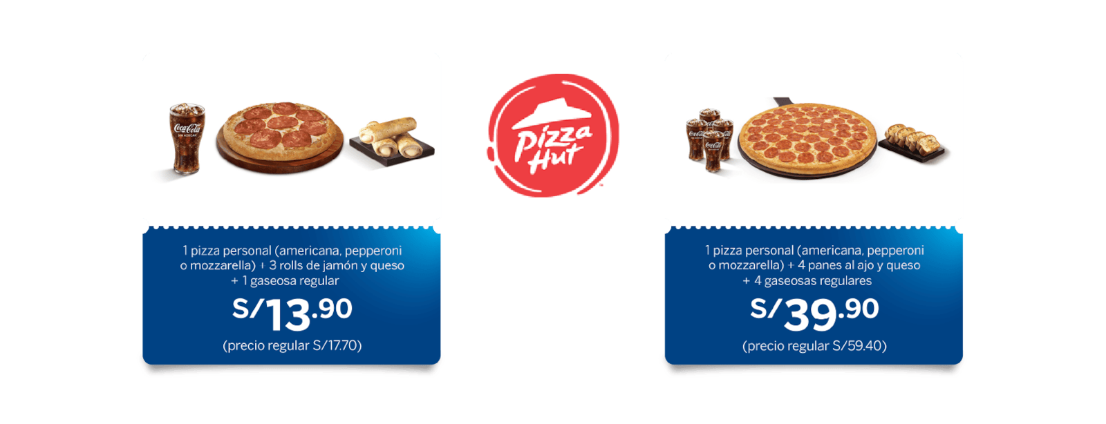 Promoción válida del 16 de diciembre de 2024 al 31 de marzo de 2025. Aplica para pagos con Tarjeta de Crédito y/o Débito del BBVA. 01 Pizza personal (americana, pepperoni o mozzarella) + 03 rolls de jamón y queso + 01 gaseosa regular (12oz) a solo S/13.90 (precio regular S/17.70). Máximo 03 promociones por cliente. Sujeto a disponibilidad de tipo de masa y disponibilidad de sabor. Válido solo para llevar en todos los locales Pizza Hut a nivel nacional. El cliente deberá solicitar el beneficio antes que se genere el comprobante de pago por parte del establecimiento, de lo contrario el descuento no podrá ser aplicable. No válido para 02 sabores en una sola pizza, ni masa hut cheese o cheesy bites. No válido para pedidos web, delivery, pick up o telefónico, ni a través de terceros (Pedidos Ya, Rappi, entre otros). No acumulable con otras promociones y/o descuentos. Sujeto a modificación sin previo aviso de acuerdo a las disposiciones del gobierno. Imágenes referenciales. Stock sujeto a disponibilidad del restaurante.