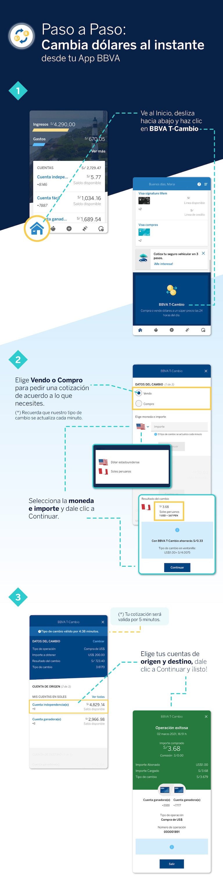 - Ser titular de 2 cuentas: una Cuenta BBVA en soles y una Cuenta BBVA en dólares.
