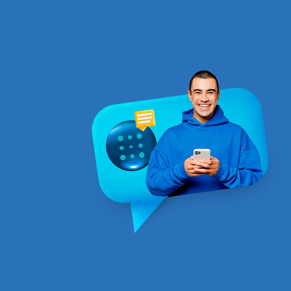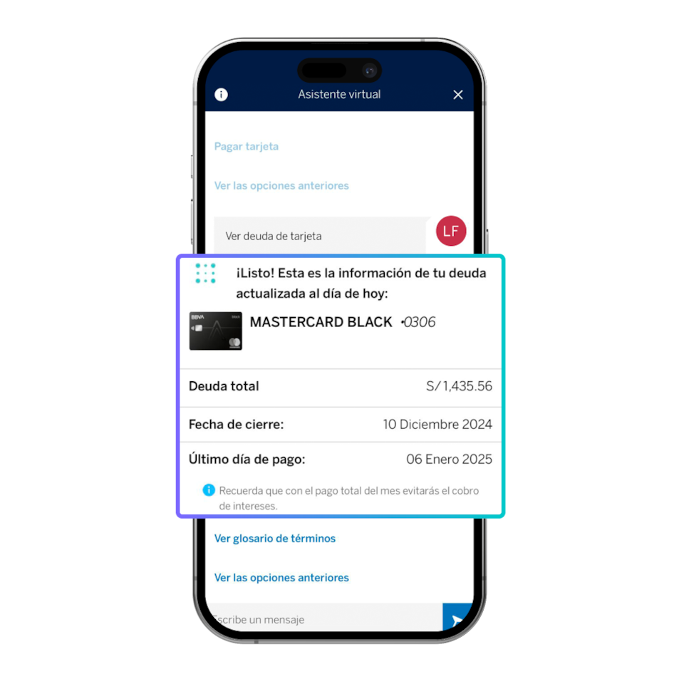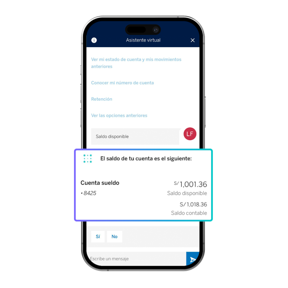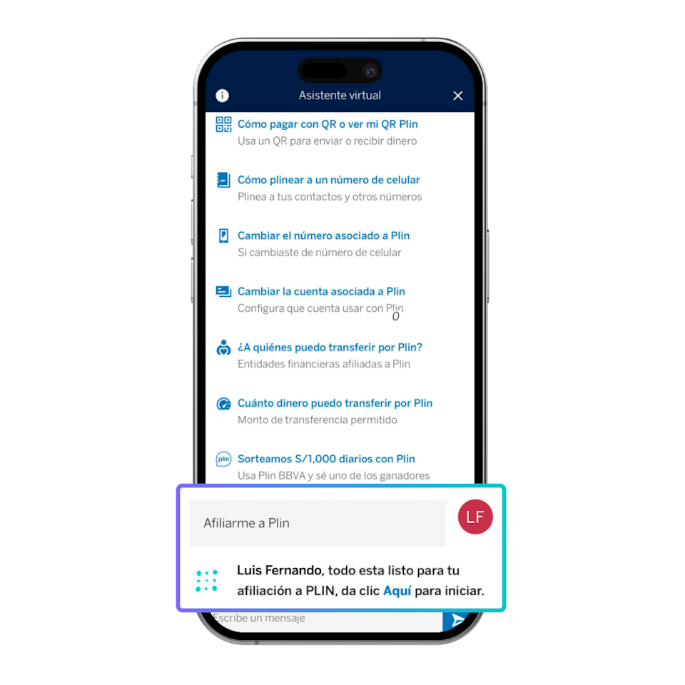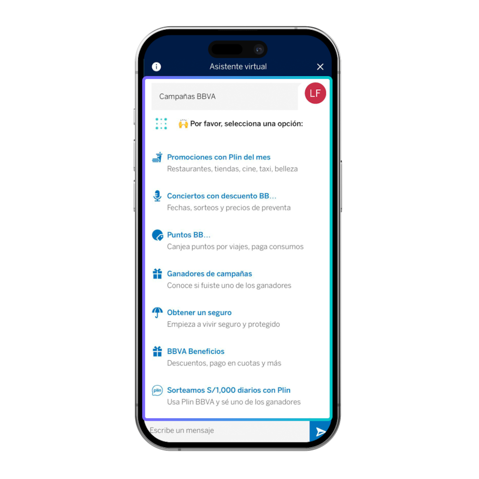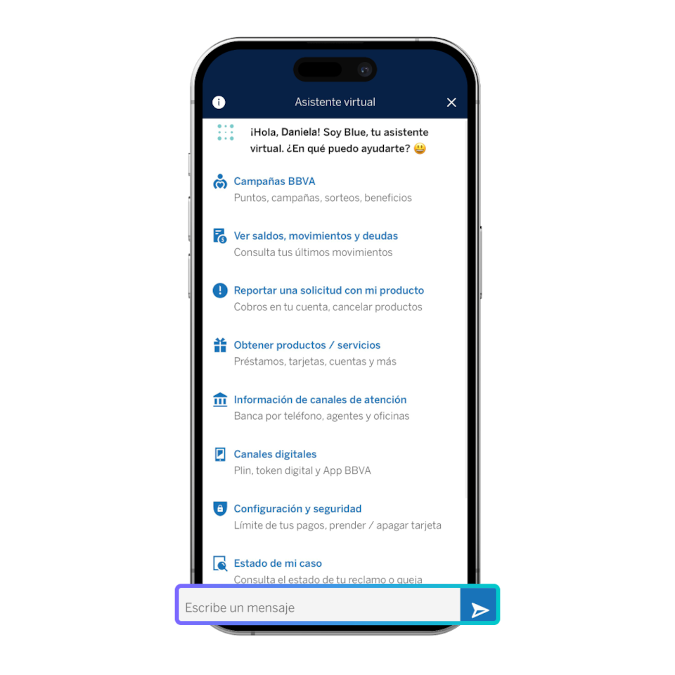 Blue es el asistente virtual de BBVA, siempre listo para ayudarte con tus dudas sobre productos, servicios y canales de atención. También te ofrece asesoría en tiempo real para realizar tus operaciones de manera sencilla y rápida.
